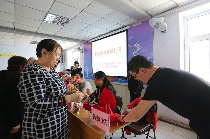 活动现场,学校护理、计算机、商务俄语、财贸、艺术等专业的师生为社区居民提供了量血压、家电维修等服务,手把手教他们工艺制作、食品雕刻和折餐巾花等技艺,计算机专业还免费为居民制作网线接头。现场吸引了大批居民参与,招生办发放宣传资料和招生简章200余份,居民们都纷纷表示学有所获,希望以后能有更多的类似活动。